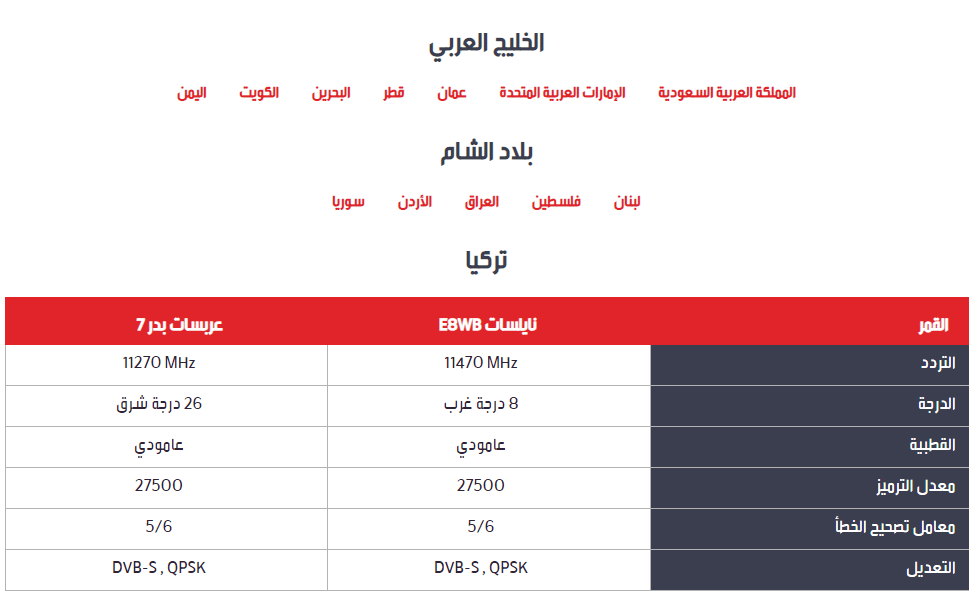 | عرب سات | 11270 | عمودي | 5/6 | تركيا والشام والخليج |
