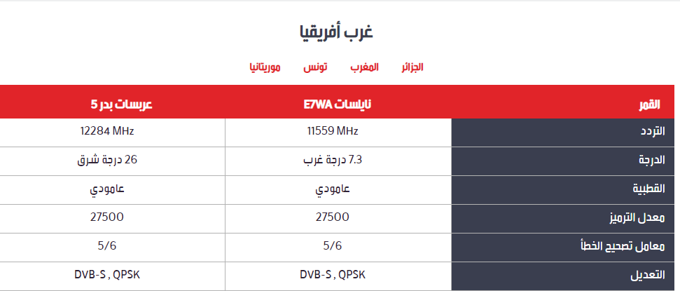 | عرب سات | 12284 | عمودي | 5/6 | غرب إفريقيا |